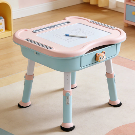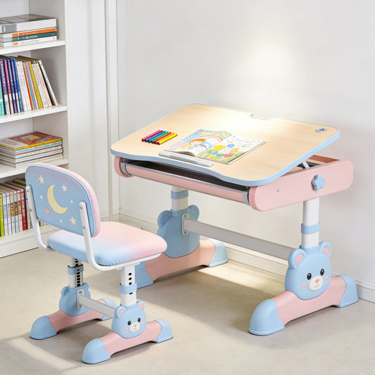 Adjustable Kids Study Desk and Chair Set - Bear Design Ergonomic School Table with Tilt Top for Girls (Pink & Blue)