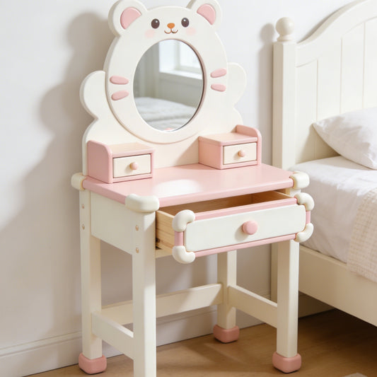 Cute Bear Kids Vanity Table - Solid Wood Toddler Dressing Table with Round Mirror and Storage Drawers (Pink & White)