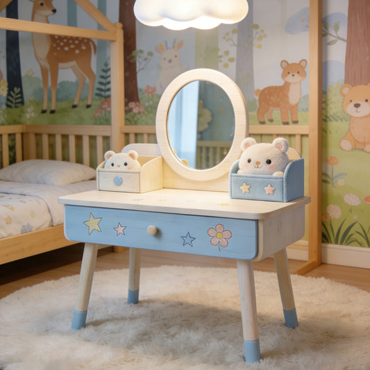 Star & Flower Kids Vanity Desk - Natural Wood Toddler Dressing Table with Oval Mirror and Storage (Light Wood & Blue)