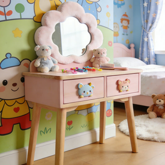 Cloud Shaped Kids Vanity Table - Fluffy Mirror Toddler Dressing Table with Double Drawers and Bear Knobs (Pink & Natural Wood)