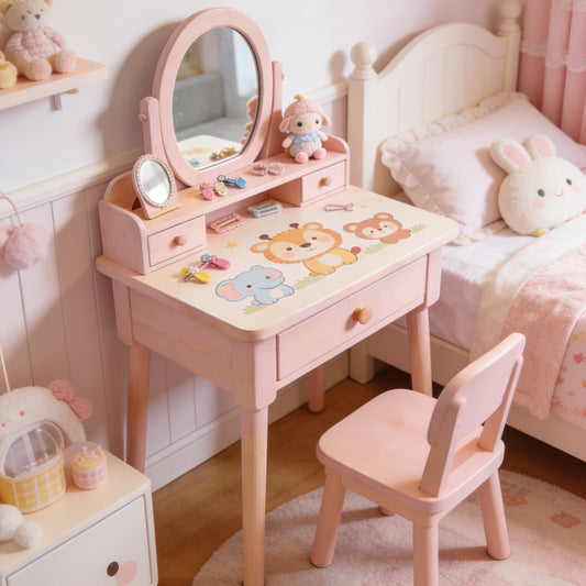 Animal Print Kids Study Desk and Chair Set - Pink Toddler Writing Table with Adjustable Mirror and StorageAnimal Print Kids Study Desk and Chair Set - Pink Toddler Writing Table with Adjustable Mirror and Storage