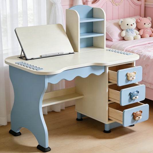 Scalloped Edge Kids Study Desk with Book Stand - Blue & White Ergonomic Writing Table with 3 Bear Drawers for Boys