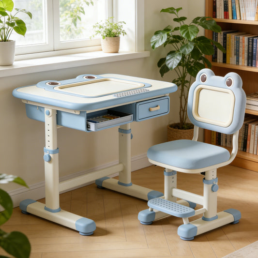 Frog Cartoon Kids Study Desk and Chair Set - Adjustable Ergonomic Writing Table with Storage Drawer for Boys (Blue & White)
